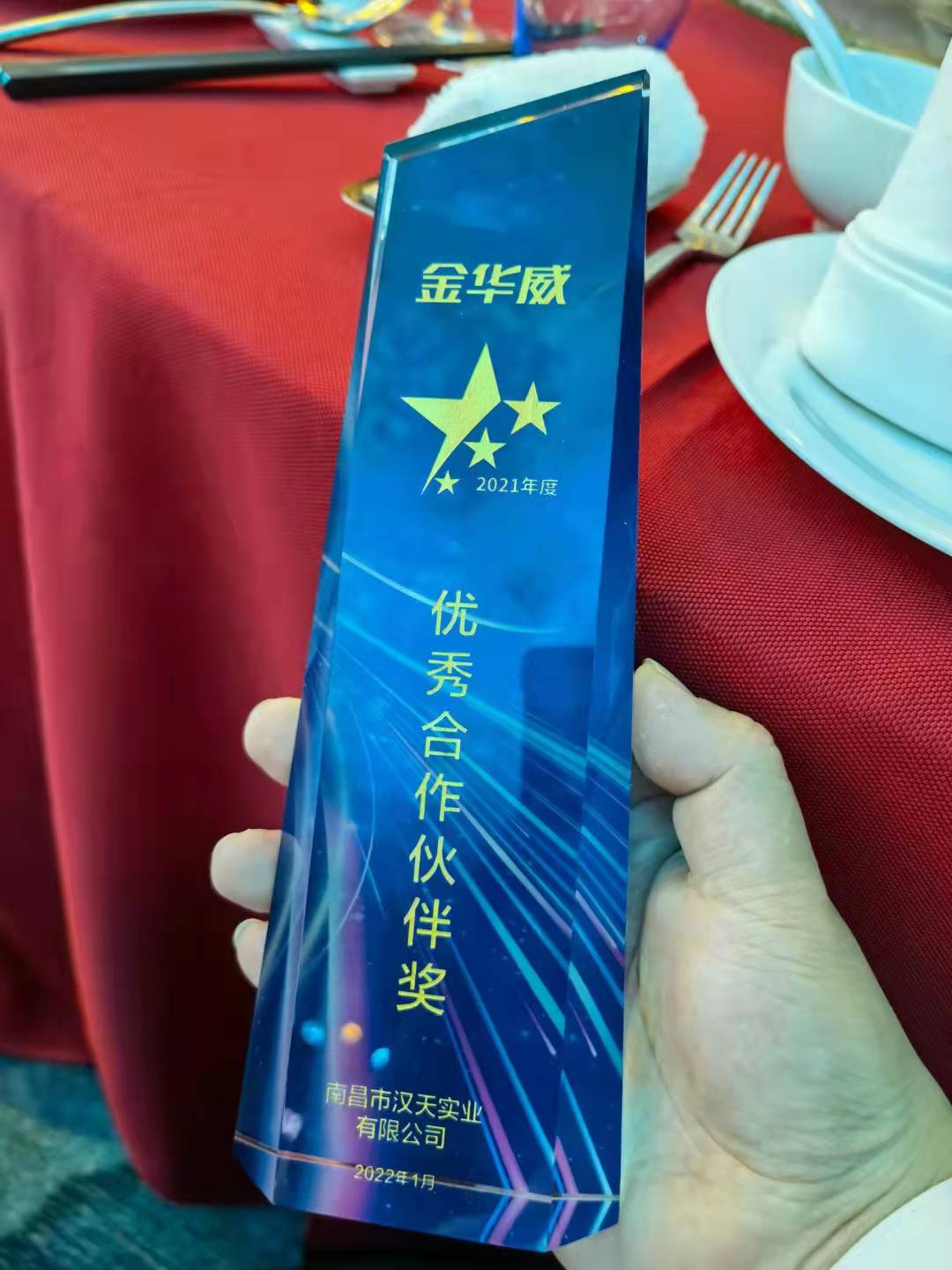 我司作為合作伙伴之一,受邀參加晚宴,并榮獲 “2021年度優(yōu)秀合作伙伴獎”,這是對我們南昌漢天綜合實力和以往合作的充分肯定。